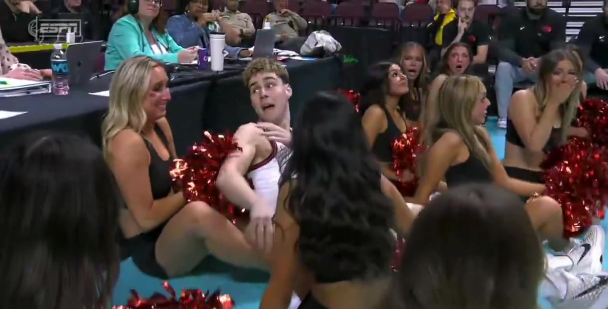 你小子故意的吧!小伙倒地滑出底线,直接扑到啦啦队美女怀里🙈