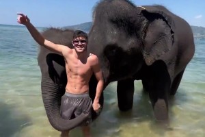 男子和大象合影,结果裤子被大象扯走