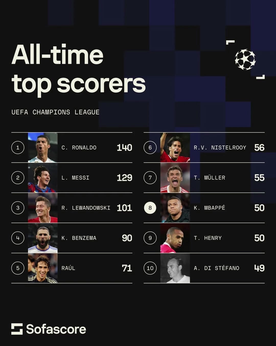欧冠史上10大最佳射手-C罗居首&比梅西多11球🏆