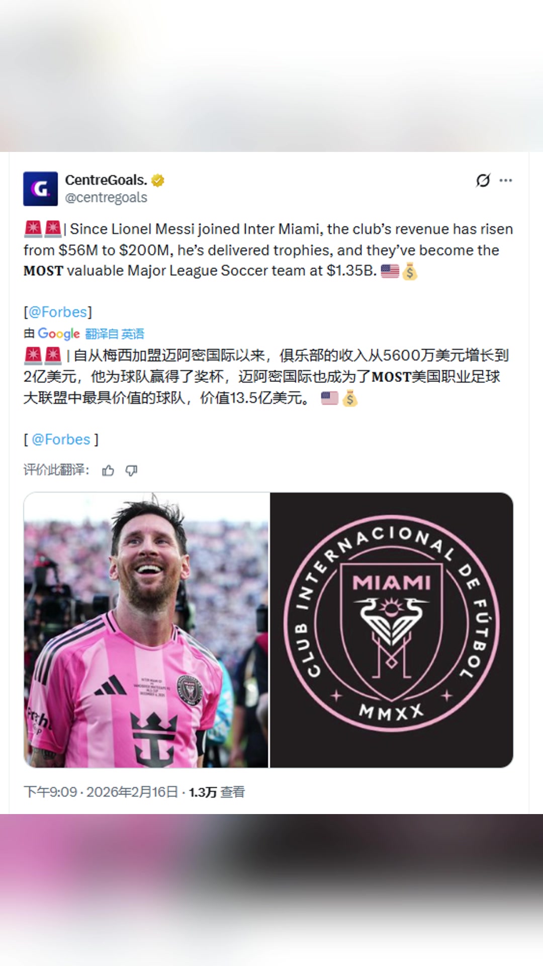 福布斯:自梅西加盟迈阿密,俱乐部收入从5600万美元增长到2亿