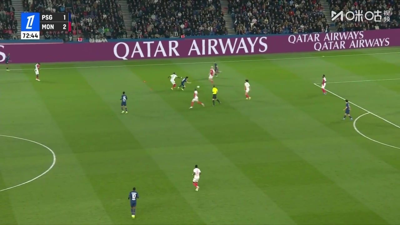 >巴黎1-3落后摩纳哥!李刚仁后场被断球!巴洛贡外围兜射远角破门
